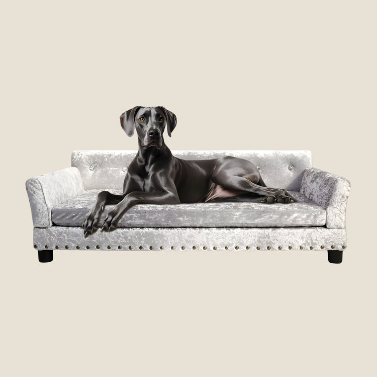 The Luna's Place Heritage Dog Sofa in Slate is luxury pet furniture built with the same materials you'd find in high-end human sofas. Deluxe Dutch velvet upholstery. Eucalyptus wood frame. Tufted backrest with rolled arms and decorative nailhead trim. Thick foam cushion that holds up to 220 lbs. It's the kind of piece that makes people say "wait — that's for the dog?"